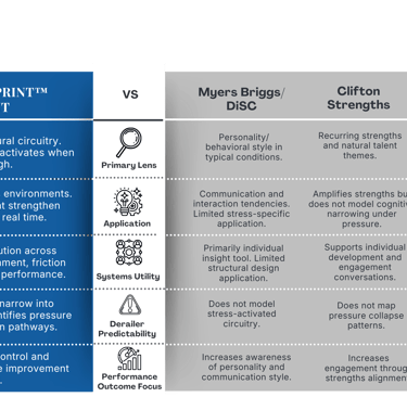 Most traditional assessments focus on communication style or behavioral tendencies. The Cognitive Blueprint™ focuses on pressure-performance architecture. It evaluates how your cognition shifts across four conditions — preference, friction, pressure, and discernment — to reveal dominant and secondary pathways. It is designed for application in real work environments, not just self-awareness.